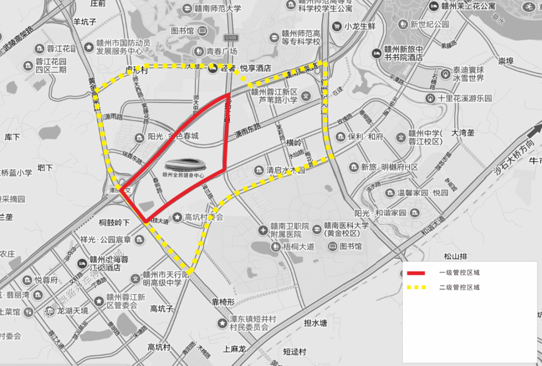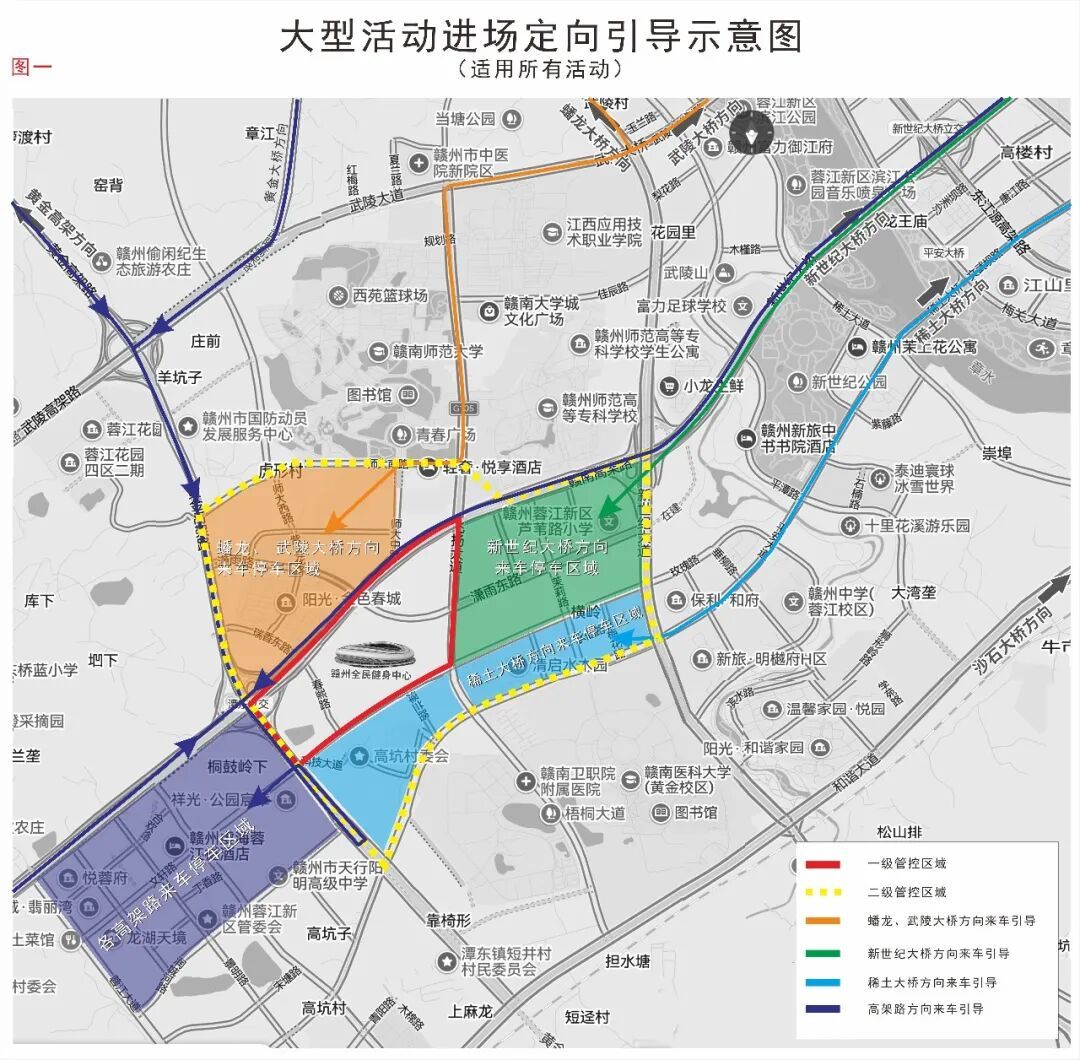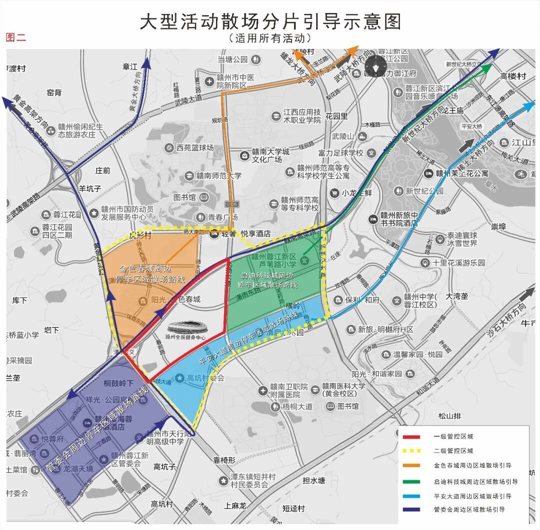 一级管控区域(下图红色线内)即场馆周边核心区,即飞扬大道、文轩路、腾飞大道、赣南大道所合围的区域及飞扬大道(文轩路至平安大道),所有车辆先往核心区通行,核心区4条道路实行即停即走,当核心区交通流量饱和后实行一级管控,禁止所有车辆驶入核心区,车辆可停放在二级管控区(下图黄色线内),即新世纪大道、平安大道、腾飞大道、师大南路合围区域;二级管控区停车饱和后,实行二级管控,禁止所有车辆(除公交车)驶入二级管控区,车辆可停放在二级管控区外。