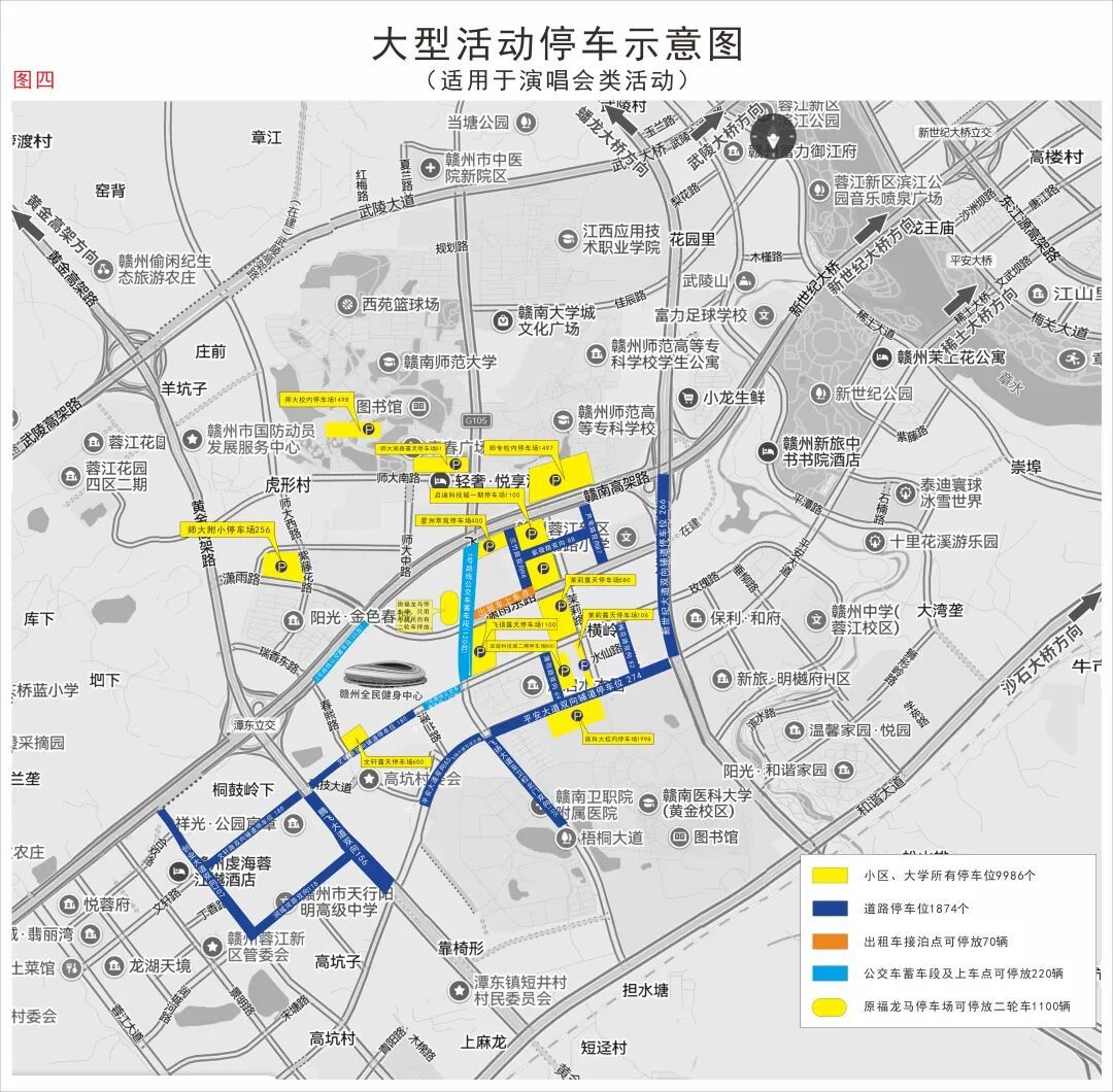 在一级(不含)管控区域外,部分机动车道及辅道允许实行单向或双向停放,启迪科技城一期停车场(需收费)、二期停车场(需收费)、星洲萃苑停车场(需收费)可停放,以及部分露天停车场可供停放,赣南师范大学、赣南医科大学、赣州师范高等专科学校校内停车场可停放,观演车辆请合理选择停放区域,确保车辆有序停放。(详情点击下方图片查看)