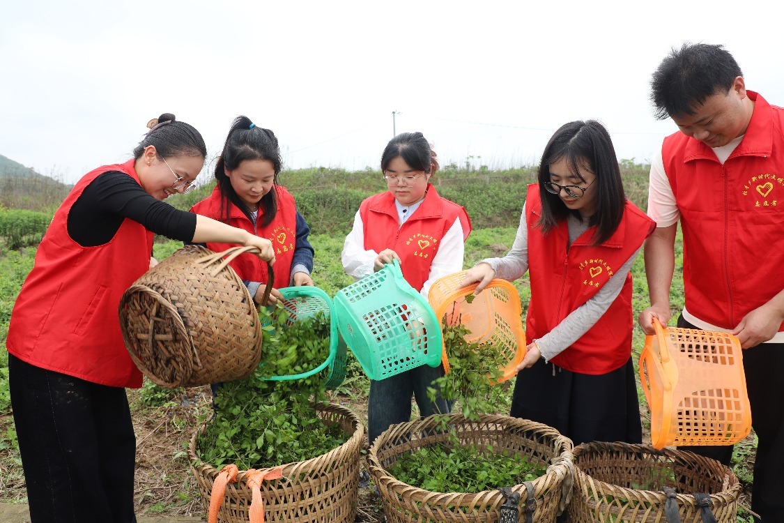 采摘、装筐、整理……志愿者们与农户分工明确,干劲十足。不一会儿,一筐筐鲜嫩的五加皮嫩芽叶便被整齐码放。