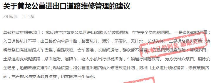 2、 协调章贡区交通局。我中心拟发函章贡区交通局,督促该局及时兑现承诺,抓紧协调吉埠村并尽快安排道路施工,该道路建成后将显著改善黄龙陵园外部通行条件,有效缓解交通拥堵,消除安全隐患。 因黄龙陵园进出道路存在的问题给您及广大市民祭扫带来的不便,我们深表歉意。