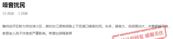 赣州经开区新力帝泊湾小区旁的东江源高架路上下匝道口,车多、噪音大、低频震动大,关窗都睡不着,家里老人孩子休息受严重影响。希望加装隔音屏。”