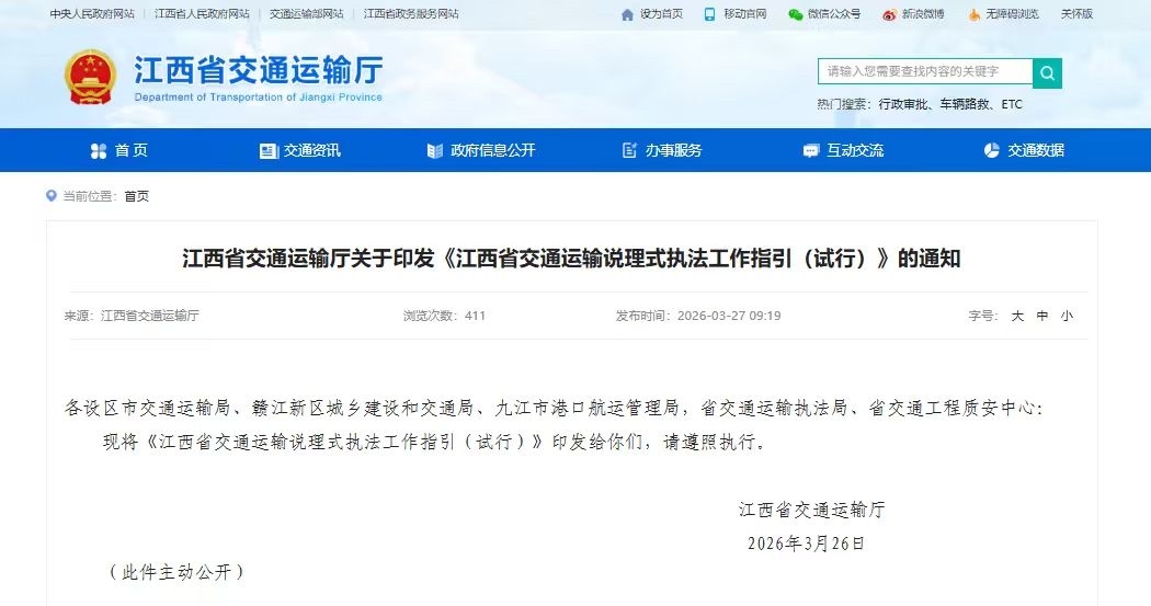 大江新闻讯 江西日报全媒体记者熊修吉报道:近日,省交通运输厅印发《江西省交通运输说理式执法工作指引(试行)》(以下简称《指引》),对说理式执法事前、事中、事后全流程操作进行规范。
