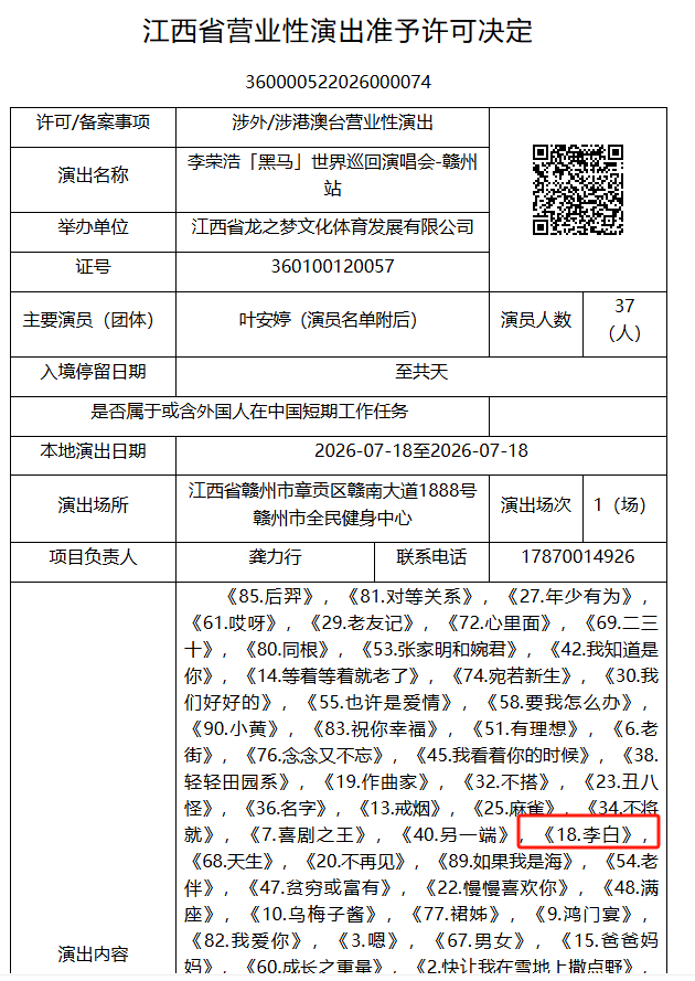 记者发现,在李荣浩演唱会赣州站的演出内容中,除了《年少有为》《乌梅子酱》《作曲家》等脍炙人口的歌曲;之前因歌手单依纯未获得李荣浩方版权授权的情况下,在其个人演唱会上演唱的歌曲《李白》,这次也出现在了名单之列。