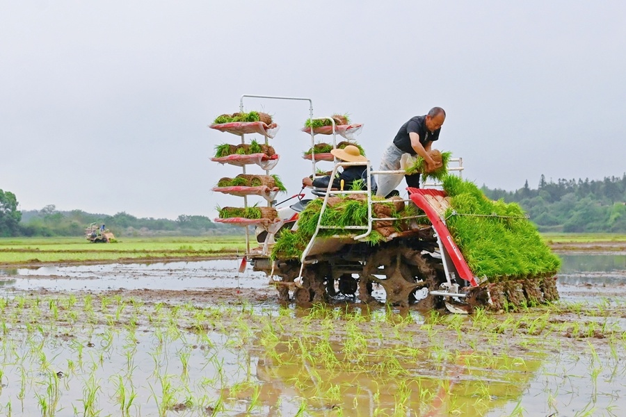 4月16日,宁都县东山坝镇大布村,农户们驾驶农机在田间机插早稻秧苗。连日来,宁都县各地农户抢抓农时进行机械化插秧作业,为粮食稳产增效打下坚实基础。胡秀宁 摄