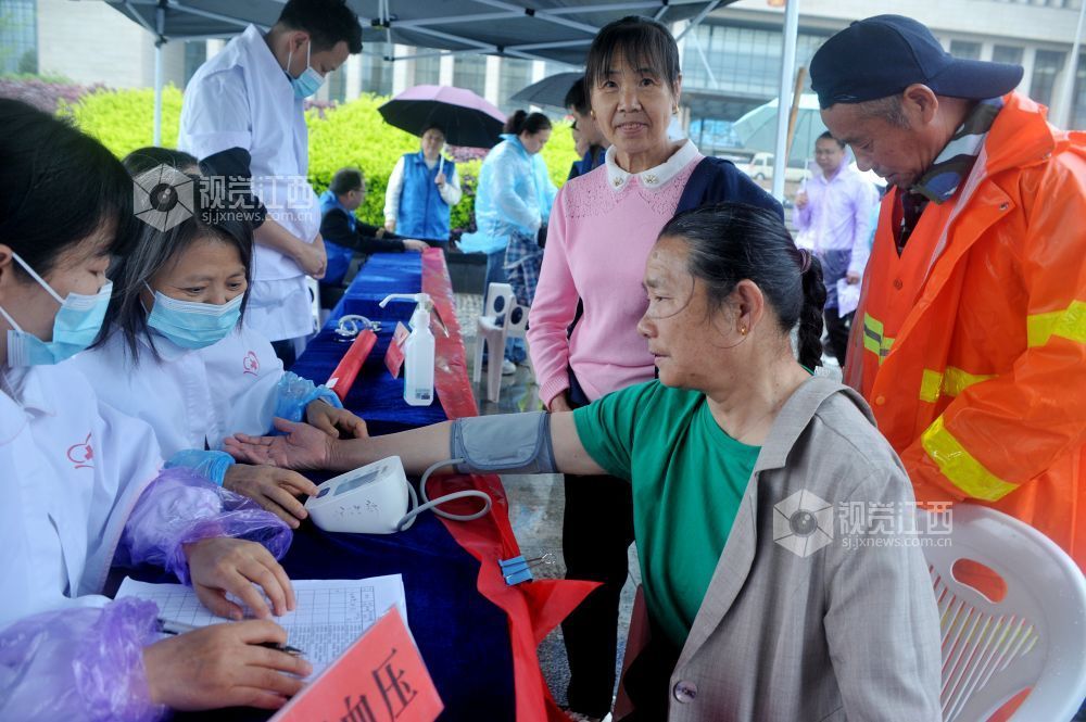 2026年4月16日,江西省德兴市的老百姓正在该市市民广场义诊活动现场测量血压。