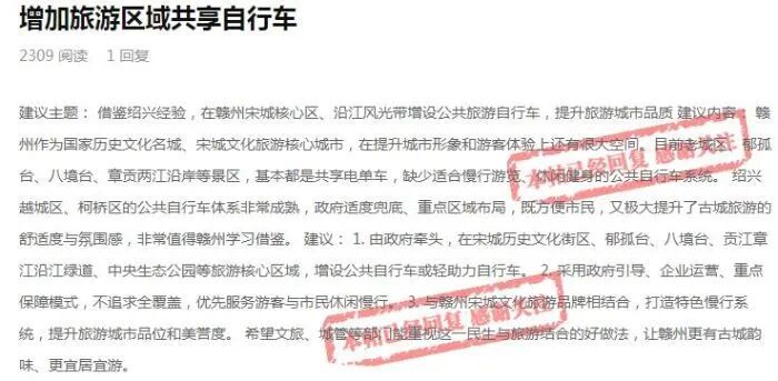 市民建议:学学绍兴,在景区周边增加共享自行车