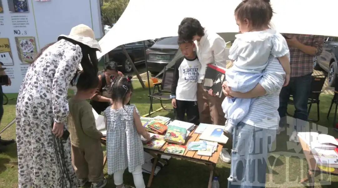 天好,书香更浓。前来淘书的市民一波接一波,不少人都是全家出动。