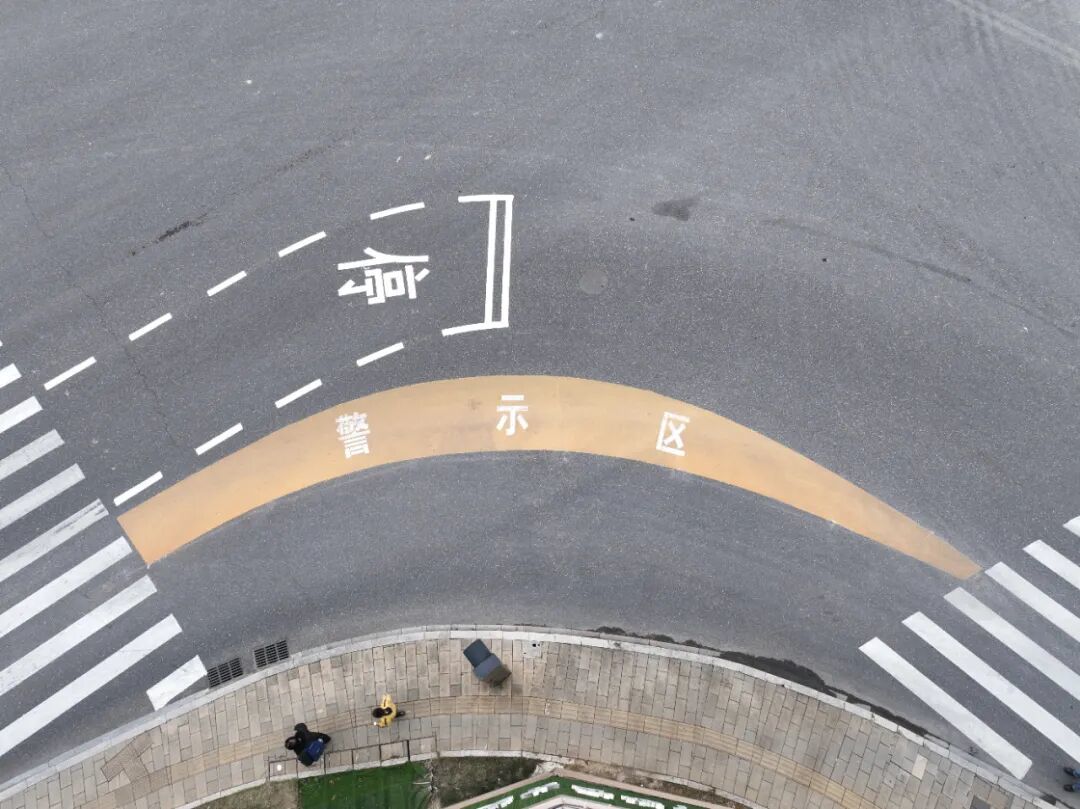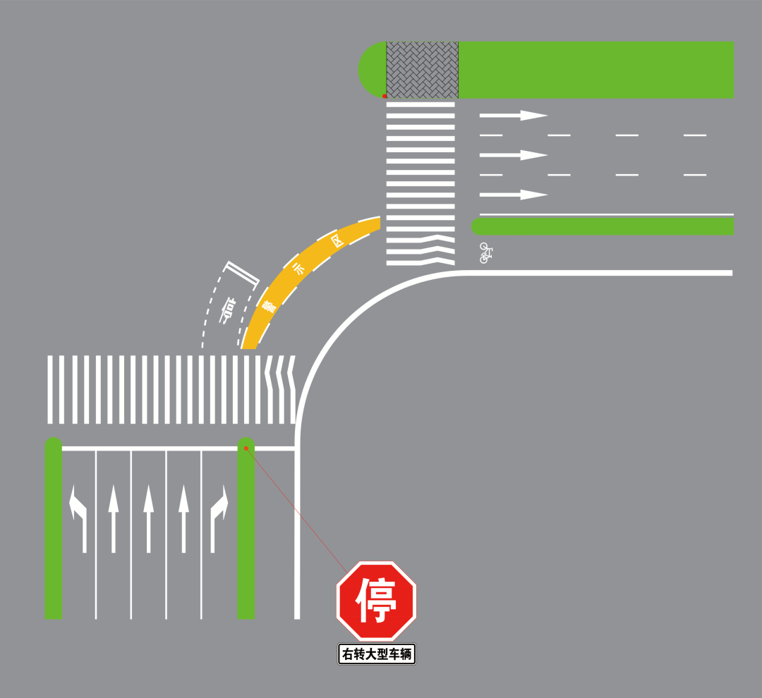 “右转警示区”图形由上弧线(大型车辆右转时右前轮行驶轨迹边缘线)、下弧线(大型车辆右转时右后轮行驶轨迹边缘线)、路面彩色铺装、路面文字组成,起到规范大型车辆右转速度与通行路径、警示行人和非机动车待行空间的作用。