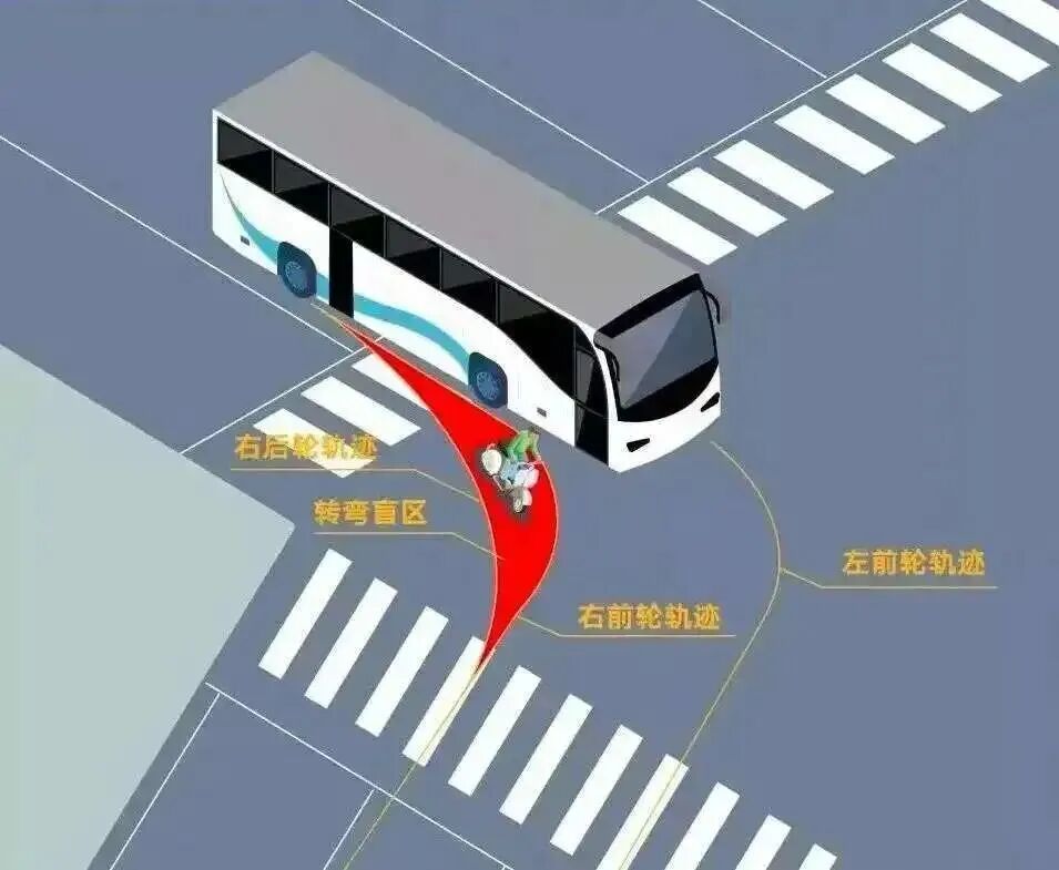 大型车辆在右转弯时,前、后车轮的运动轨迹不在一条弧线上,存在前内轮转弯半径与后内轮转弯半径之差即“内轮差”,形成了一个非常危险的“弯月区”,这个区域不仅是司机的视野盲区,还特别容易把行人卷进去!(我们在路口划线的区域即是右转警示区),而且车身越长,“内轮差”的范围就越大。