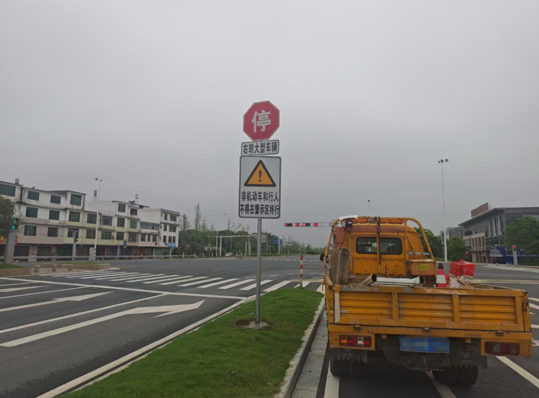 蓉江新区交管大队在辖区部分核心路口,设置了“右转警示区”,并采取右转必停管理措施,大货车司机在路口右转时,请及时观察,严格遵守右转必停相关规定,时刻牢记“停车、观察、起步、缓行”!