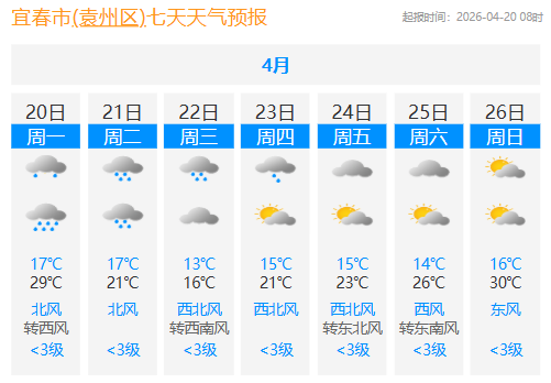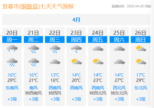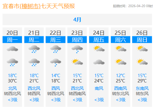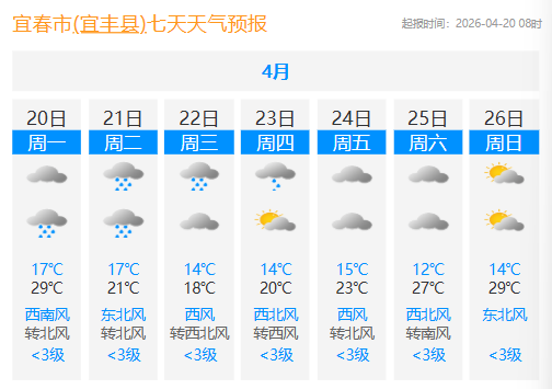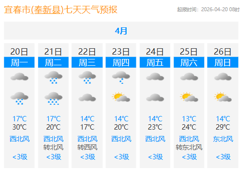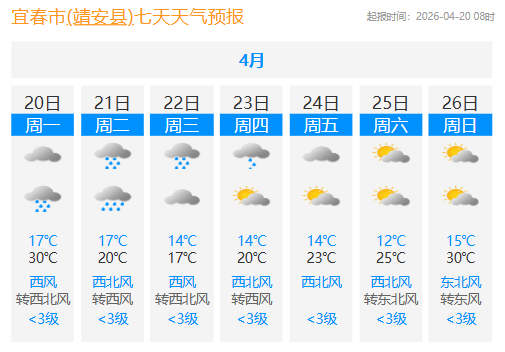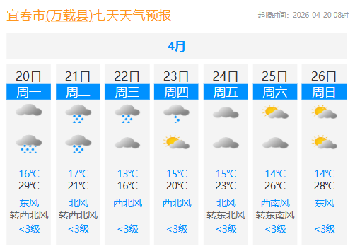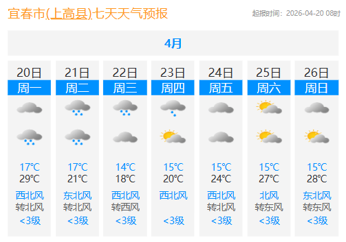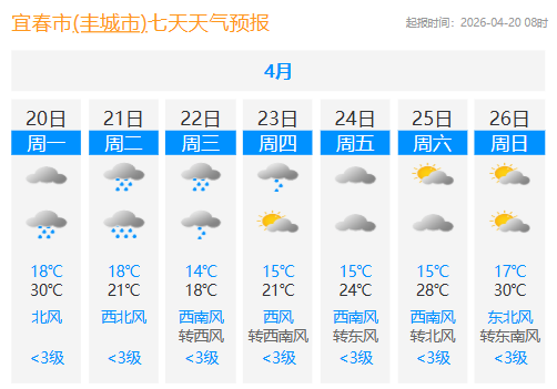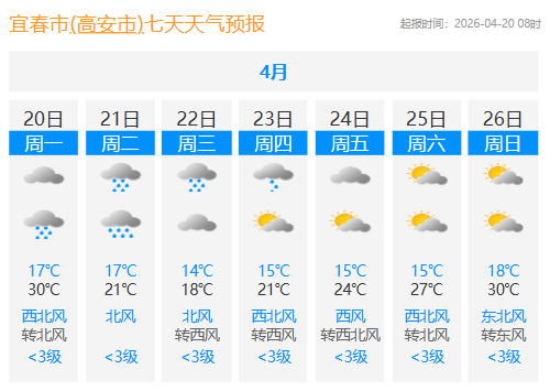 23日:西南部(袁州、万载)阴天为主,其他地区多云间阴天,气温14~21℃。