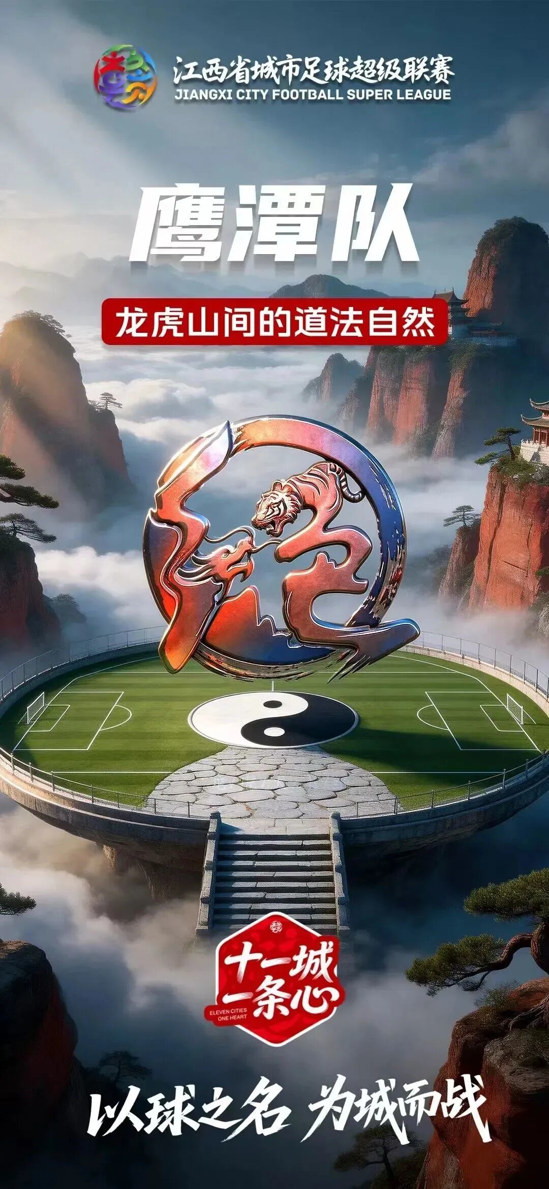 鹰潭队队徽以道文化为核心,以龙虎骨为笔韵,将鹰潭龙虎山的自然与人文底蕴融于方寸之间。下方融入丹霞仙山轮廓,溪河蜿蜒流畅,尽显道法自然的灵动,传递出“仙山禅道映龙虎”的独特气质。色彩上以渐变的红与蓝象征天地交融,整体风格古朴而不失现代,既承载千年优秀传统道文化的厚重,又适配当代体育传播的多元场景。