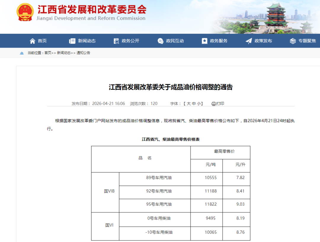 4月21日,江西省发展和改革委发布关于成品油价格调整的通告。