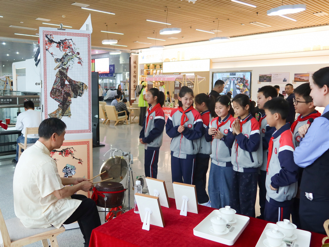 两百余公里外的萍乡北站“城市文明会客厅”内,同样热闹非凡。“原来萍乡有这么多非遗技艺,真是大开眼界。”旅客刘先生一边观看皮影戏,一边用手机记录精彩瞬间。现场集中展示萍乡春锣、湘东傩面具、花果雕刻、剪纸、皮影戏等非遗项目,非遗大师轮番展演,精妙的花果雕刻、灵动的套色剪纸、韵味十足的皮影戏《昭王问孔》,引得往来旅客频频驻足、点赞叫好。