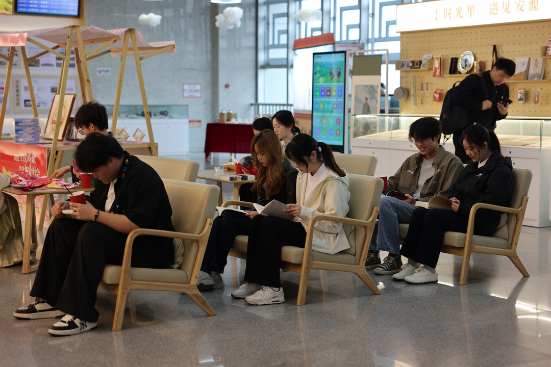 南昌西站“书香驿站”内,读书角、自助借书柜整齐摆放着各类优质图书,海昏侯文化展区的马蹄金、编钟复刻展品,更为这里增添了浓厚的赣鄱人文底蕴,吸引众多旅客驻足打卡、静心阅读。