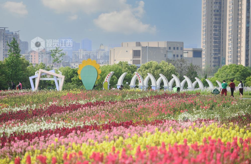 2026年4月19日,南昌市马兰圩湿地公园内,鲁冰花、马鞭草等多种花卉竞相绽放,五彩斑斓的花海与城市楼宇相映成趣,市民漫步其间尽享春日美好。 视觉江西 段长征 摄