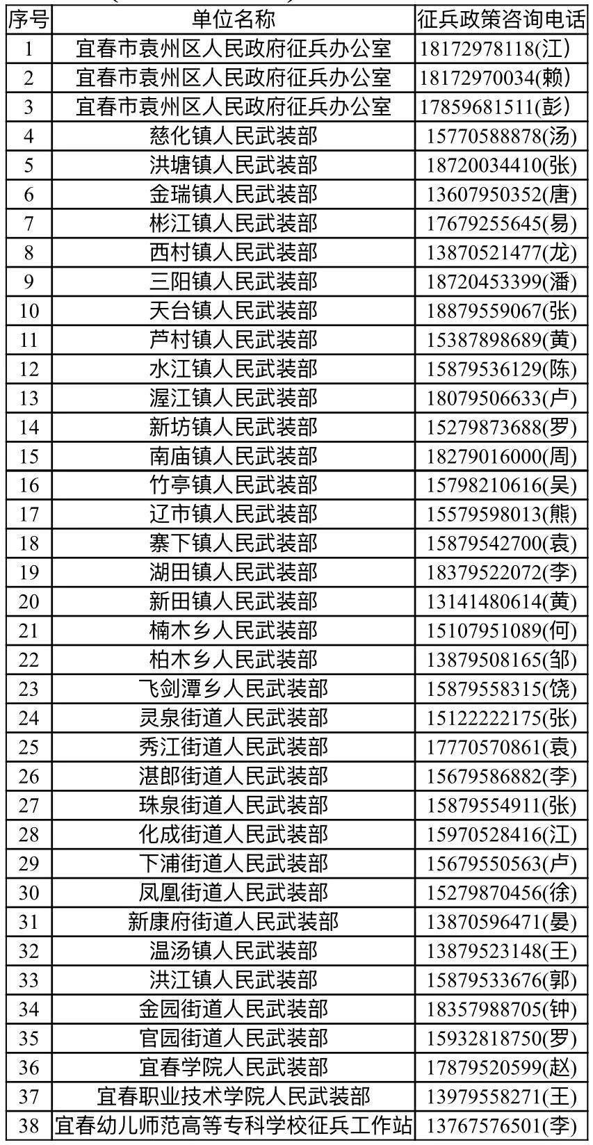 ①咨询/举报电话:宜春市袁州区人民政府征兵办公室电话0795-3222456、07953224985、07953224725、18172978112(吴)、18172978118(江)、18172978812(易)。