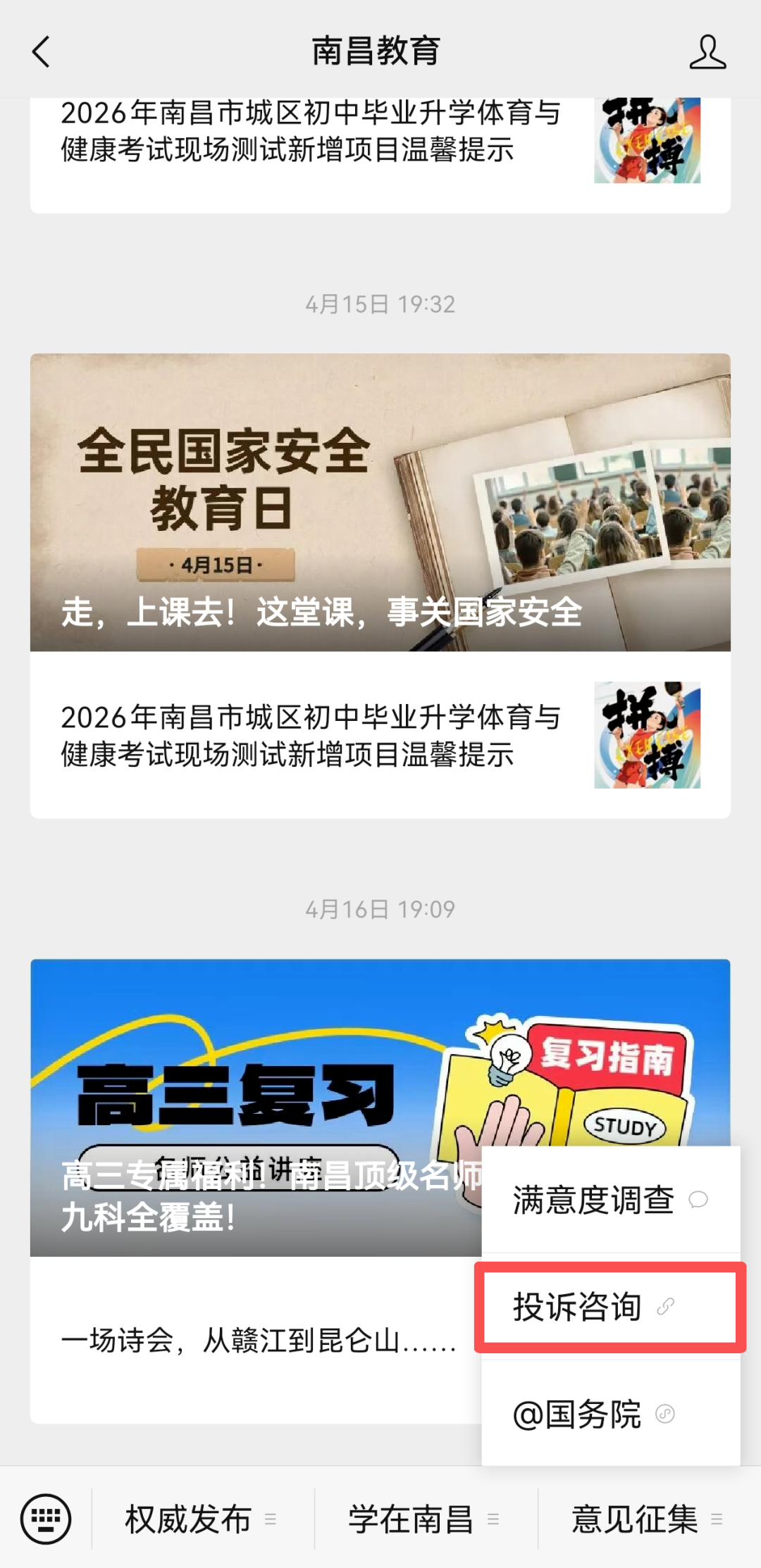 关注“南昌教育”官方微信公众号,点击底部菜单栏【意见征集】,选择【投诉咨询】即可进入信息反馈页面。