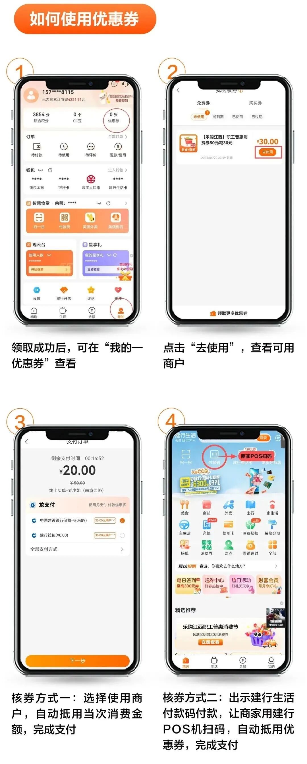 3.4月30日12:00前进入APP,点击首页“乐购吉安 职工普惠消费节”活动专区,点击领取即可。