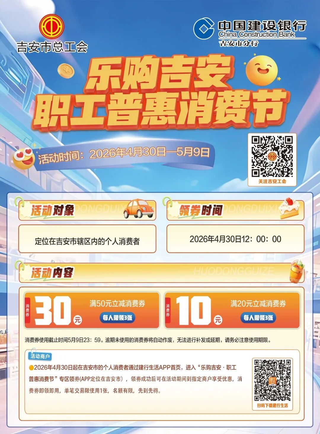 为落实市委、市政府深入开展提振消费专项行动计划,根据江西省总工会《关于开展工会促消费工作的通知》(赣工办发〔2026〕29号)要求,不断激发市场活力,促进全市职工消费,丰富职工生活,吉安市总工会自4月30日起通过“建行生活APP”面向全市消费者发放工会消费券,快来看看吧!