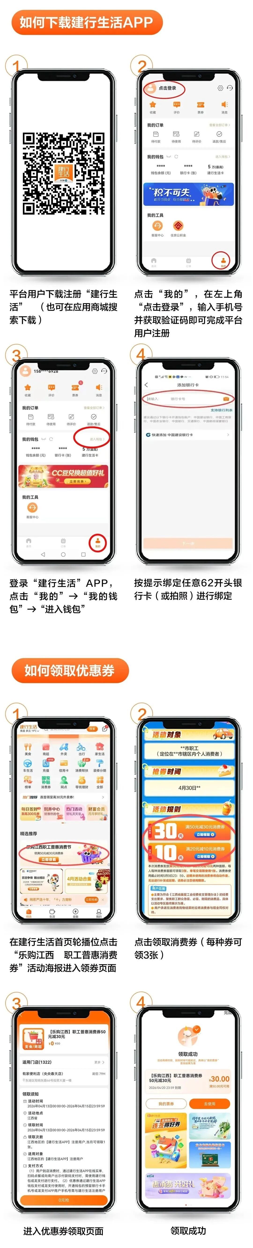 关注“吉安工会”微信公众号,点击“会员中心”中的“工会消费券”领取,或下载注册“建行生活”APP,按以下步骤领取: