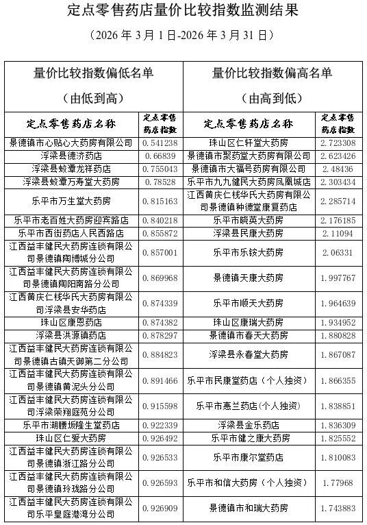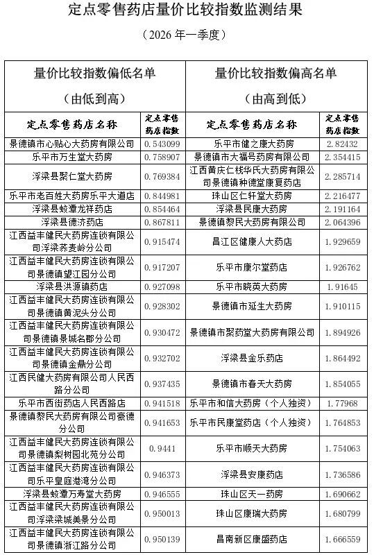 为深入贯彻国家医保局关于加强药品价格监管决策部署,大力推进定点零售药店医保药品“阴阳价格”监测处置,加强定点零售药店价格管理,巩固价格治理成效,减轻群众购药负担,我市依托全省医保信息系统,常态化开展定点零售药店“量价比较指数”监测。现将2026年3月、2026年一季度全市定点零售药店量价比较指数偏高风险的前20家和量价指数偏低的20家药店名单予以公布。