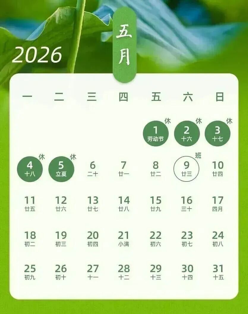放假时间:2026年5月1日至5月5日,共5天。