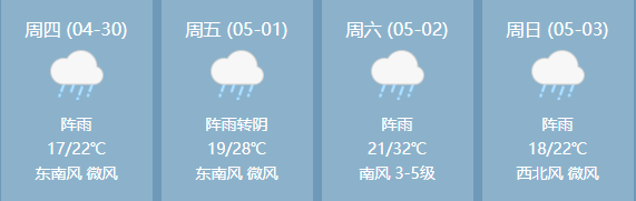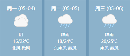 五一假期期间,我市天气预计以阵雨为主,出门请带好雨具,气温有所升高,驾车出行谨防疲劳驾驶。