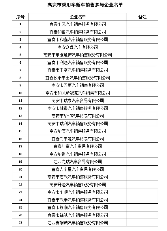 参与商户:高安市乘用车新车销售企业(见附件)。