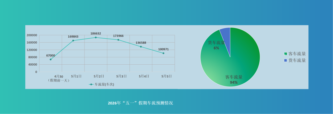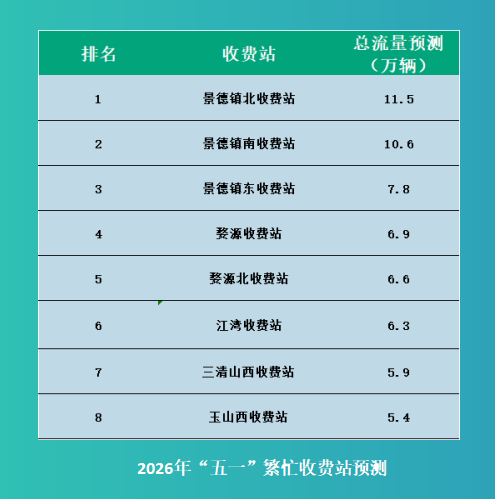 总体流量:预测2026年“五一”假期,景德镇管理中心所辖高速公路出入口总车流量76.8万辆,较2025年“五一”假期同比增长3.57%左右;“五一”假期车流最高峰将出现在5月1日8时至12时;5月2日至5月4日车流量高峰主要集中在每日11时至12时,次高峰约在17时至19时;5月5日返程高峰出现在14时至20时之间。
