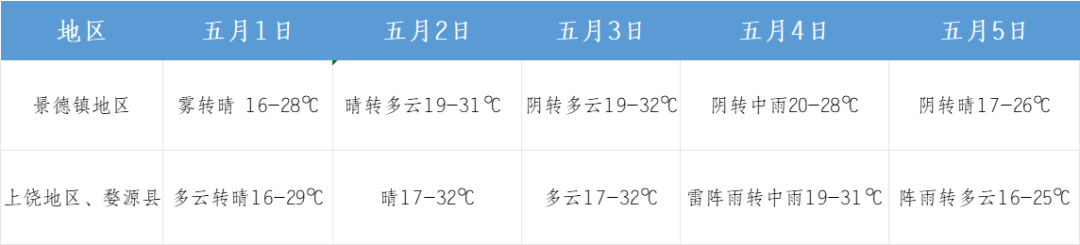 5月1日至3日期间,景德镇市区、上饶市区、婺源县天气以晴好多云天气为主,整体适宜旅游、户外活动。
