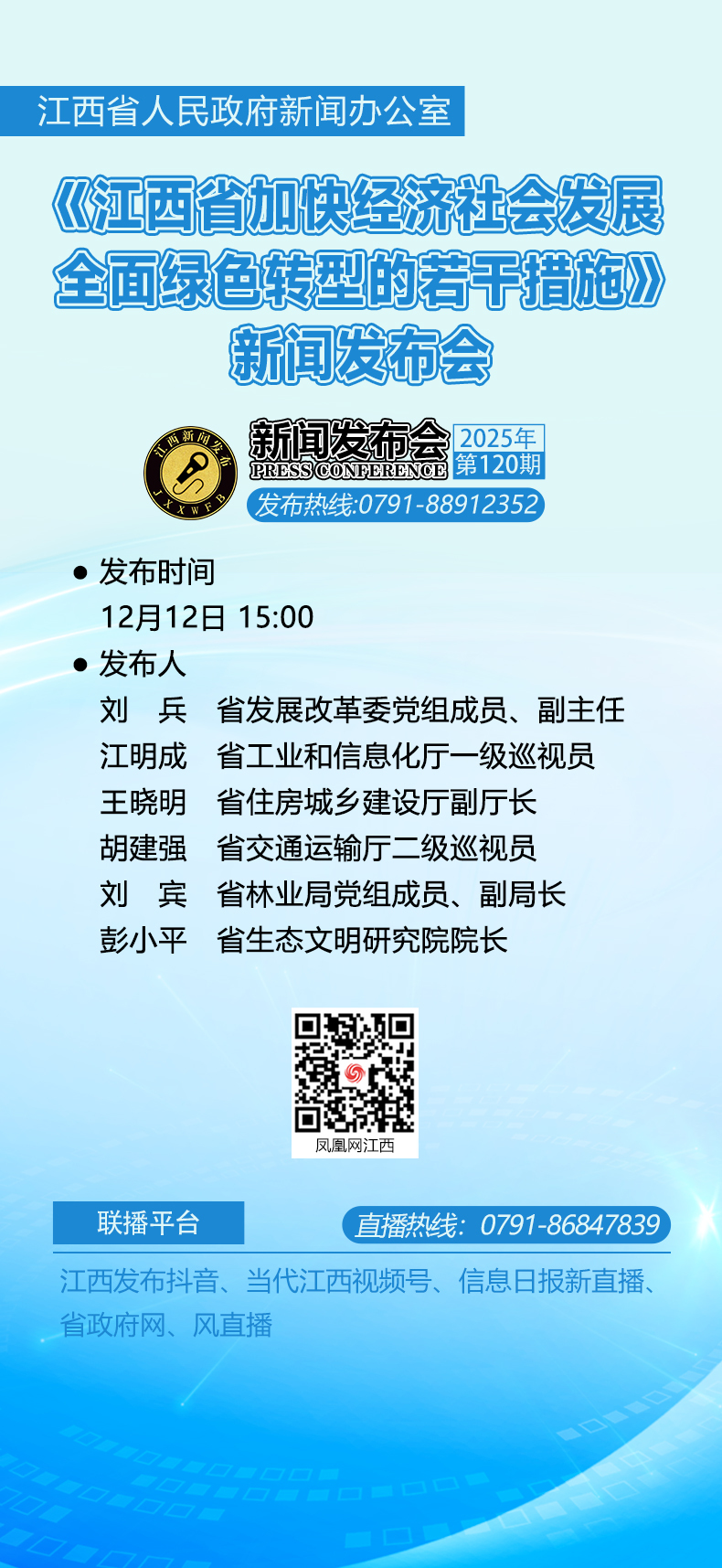 2025年12月12日15:00,江西省人民政府新闻办新闻发布厅举行《江西省加快经济社会发展全面绿色转型的若干措施》新闻发布会,省发展改革委党组成员、副主任刘兵发布和介绍有关情况。省工业和信息化厅一级巡视员江明成,省住房城乡建设厅副厅长王晓明,省交通运输厅二级巡视员胡建强,省林业局党组成员、副局长刘宾,省生态文明研究院院长彭小平出席新闻发布会,并回答记者提问。